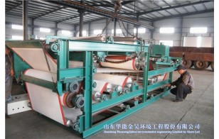 带式压滤机的工作原理:经过絮凝的悬浮物料在重力脱水段脱去大部分游离水,物料逐渐得到进一步浓缩,然后通过翻转机构卸料至上下滤带之间,进入楔形区内进行预压脱水,经主脱水辊脱水后,进入系列S形排列的压辊压榨脱水直至形成滤饼后卸料。在这过程中污泥受到由小到大的挤压,剪切作用力,可脱去其中大部分游离水和部分毛细水份。
